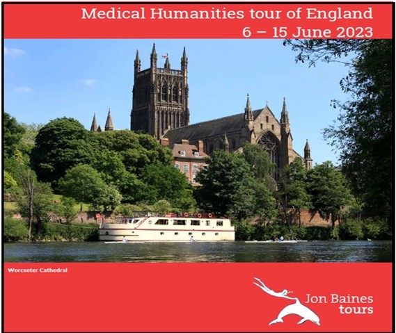 The Worcester District Medical Society sponsored a medical history and humanities tour of England from June 6-15, 2023 and we had a ball! Designed by tour agency Jon Baines (of England) in coordination with WDMS curator Dale Magee the tour started in London, went to Bath, Bristol then Worcester (of course!) finishing up through Oxford and back to London with stops in between at the Jenner house, the Erasmus Darwin house (a physician and grandfather to Charles) and Stratford-upon-Avon.